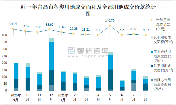 近一年青島市各類用地成交面積及全部用地成交價款統(tǒng)計圖