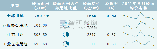 根據國信房地產信息網數據統(tǒng)計可知:2021年8月青島市全部用地出讓地面均價為5825元/㎡,其中住宅用地出讓地面均價最高(7748元/㎡),全部用地成交地面均價為888元/㎡,其中住宅用地成交地面均價為1203元/㎡,低于商服辦公用地成交地面均價;2021年1-8月青島市住宅用地樓面面積占其全部用地比重最多,為45.09%,溢價率為0.87%。