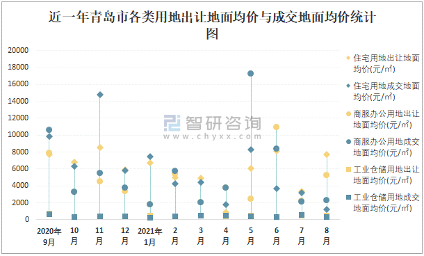 近一年青島市各類用地出讓地面均價與成交地面均價統(tǒng)計圖