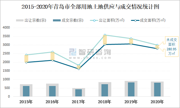 2015-2020年青島市全部用地土地供應與成交情況統(tǒng)計圖