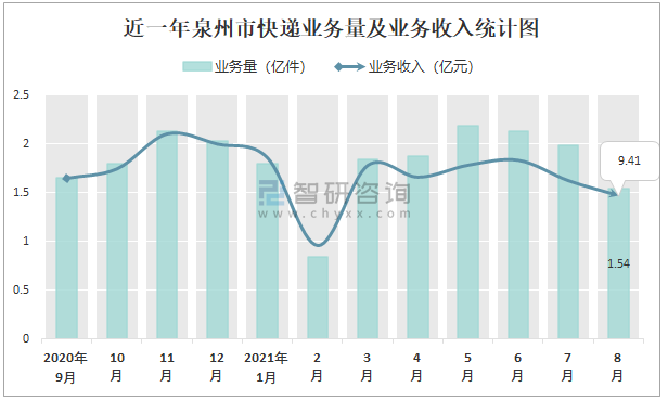2021年8月泉州市快遞業務量與業務收入分別為15439.47萬件和94061.07萬元