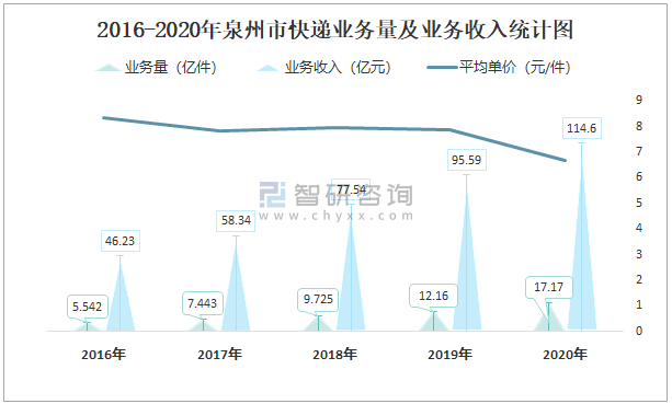 2016-2020年泉州市快遞業務量及業務收入統計圖