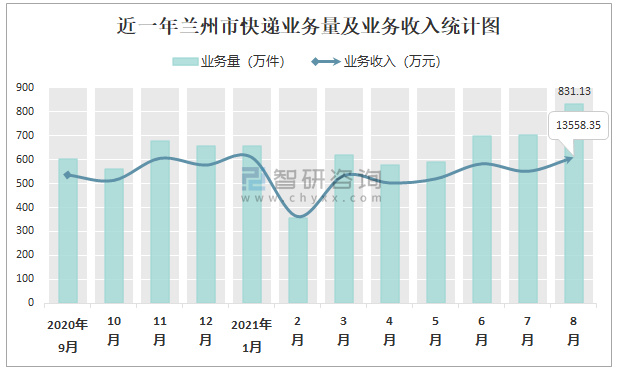 根據各省市郵政局數據可知:2021年8月蘭州市快遞業務量為831.13萬件,業務收入為13558.35萬元;2021年1-8月蘭州市快遞累計業務量為5035.69萬件,同比增長29.4%,累計業務收入為95044.94萬元,同比增長3.65%;2016-2020年蘭州市快遞業務量與業務收入均逐年遞增,平均單價2019年達到最大值,次年有所下滑。