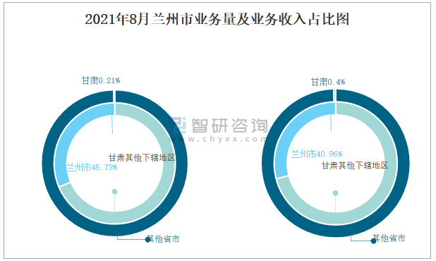 根據各省市郵政局數據可知:2021年8月蘭州市快遞業務量占甘肅快遞業務量的45.73%,甘肅快遞業務量占全國快遞業務量的0.21%;2021年8月蘭州市快遞業務收入占甘肅快遞業務收入的40.96%,甘肅快遞業務收入占全國快遞業務收入的0.4%。