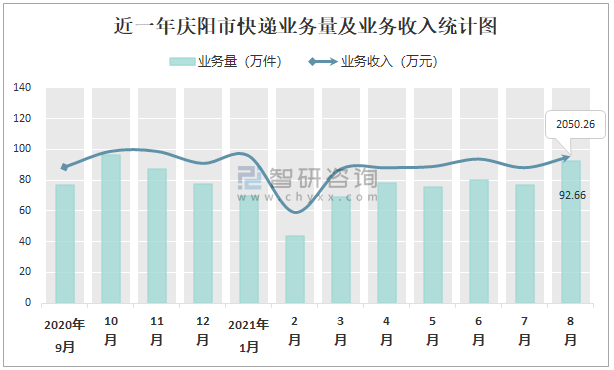 近一年平涼市快遞業務量及業務收入統計圖