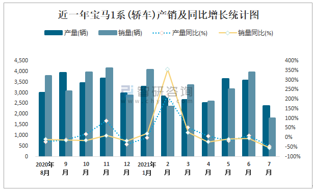 近一年寶馬1系(轎車)產(chǎn)銷及同比增長(zhǎng)統(tǒng)計(jì)圖