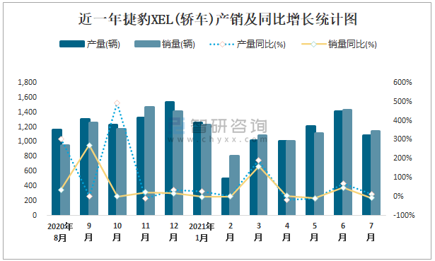 近一年捷豹XEL(轎車(chē))產(chǎn)銷(xiāo)及同比增長(zhǎng)統(tǒng)計(jì)圖