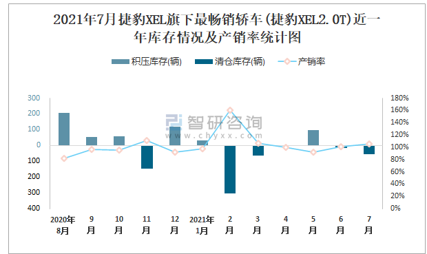 2021年7月捷豹XEL旗下最暢銷(xiāo)車(chē)(捷豹XEL2.0T)近一年庫(kù)存情況及產(chǎn)銷(xiāo)率統(tǒng)計(jì)圖