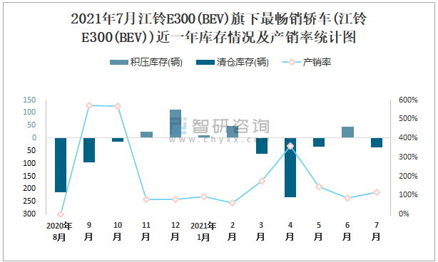 2021年7月江鈴E300(BEV)旗下最暢銷車(江鈴E300(BEV))近一年庫(kù)存情況及產(chǎn)銷率統(tǒng)計(jì)圖