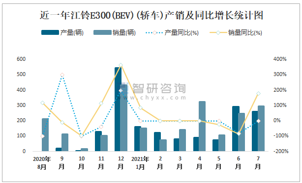 近一年江鈴E300(BEV)(轎車)產(chǎn)銷及同比增長(zhǎng)統(tǒng)計(jì)圖