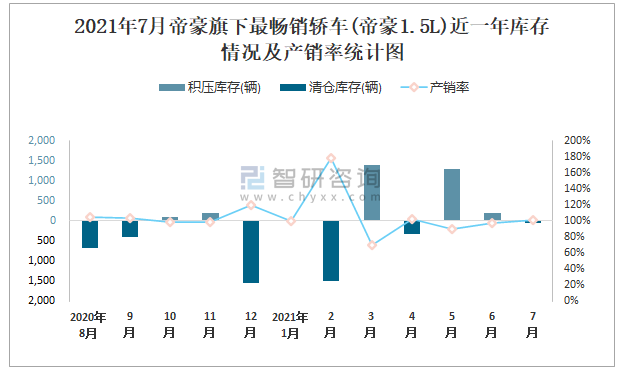 2021年7月帝豪旗下最暢銷車(帝豪1.5L)近一年庫存情況及產銷率統計圖
