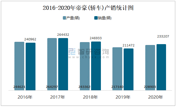 2016-2020年帝豪(轎車)產銷統計圖