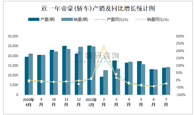 2021年7月帝豪(轎車)產銷量分別為13848輛和14163輛 當月產銷率為102.27%