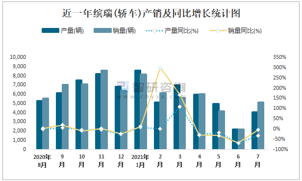 根據(jù)中國(guó)汽車工業(yè)協(xié)會(huì)數(shù)據(jù)可知:2021年7月繽瑞(轎車)產(chǎn)量為4068輛,同比下降33.5%,銷量為5149輛,同比下降4.3%,當(dāng)月產(chǎn)銷率為126.57%;2021年1-7月繽瑞(轎車)累計(jì)產(chǎn)量為37911輛,同比下降2.8%,累計(jì)銷量為37425輛,同比下降0.8%,累計(jì)產(chǎn)銷率為98.72%;2018-2020年繽瑞(轎車)產(chǎn)銷量均在2019年達(dá)到最高值,此后有所下滑,且近3年總產(chǎn)量大于總銷量,積壓了庫存1593輛。
