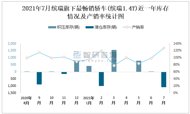 2021年7月繽瑞旗下最暢銷車(繽瑞1.4T)近一年庫存情況及產(chǎn)銷率統(tǒng)計(jì)圖