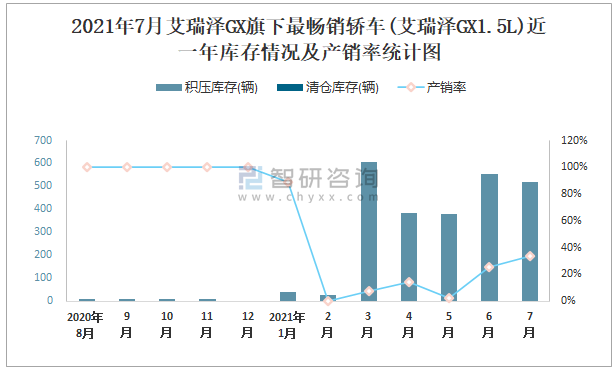 2021年7月艾瑞澤GX旗下最暢銷車(艾瑞澤GX1.5L)近一年庫(kù)存情況及產(chǎn)銷率統(tǒng)計(jì)圖