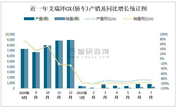近一年艾瑞澤GX(轎車)產(chǎn)銷及同比增長(zhǎng)統(tǒng)計(jì)圖