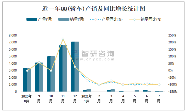 根據(jù)中國汽車工業(yè)協(xié)會(huì)數(shù)據(jù)可知:2021年7月QQ(轎車)產(chǎn)量為63輛,同比下降97.9%,銷量為20輛,同比下降99.4%,當(dāng)月產(chǎn)銷率為31.75%;2021年1-7月QQ(轎車)累計(jì)產(chǎn)量為831輛,同比下降93.8%,累計(jì)銷量為961輛,同比下降92.8%,累計(jì)產(chǎn)銷率為115.64%;2016-2020年QQ(轎車)產(chǎn)銷量2019年跌至最低值,此后有所回升,且近5年總銷量大于總產(chǎn)量,清倉庫存2378輛。