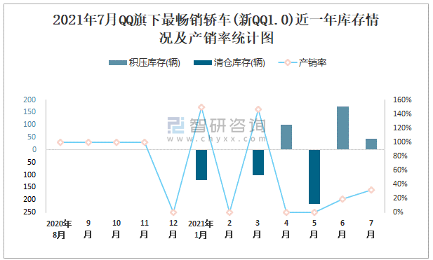 2021年7月QQ旗下最暢銷車(新QQ1.0)近一年庫存情況及產(chǎn)銷率統(tǒng)計(jì)圖