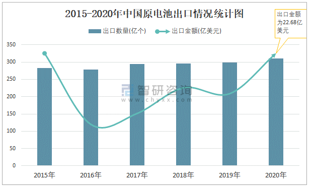 2015-2020年中國原電池出口情況統計圖