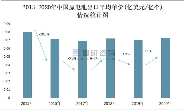 根據中國海關數據顯示:2015-2020年中國原電池出口數量與出口金額均在2016年跌至最低值,此后總體呈上升趨勢;2015-2020年中國原電池出口平均單價2018年增長速度最快,而2016年中國原電池出口平均單價下降速度最快,下滑了10.5%。