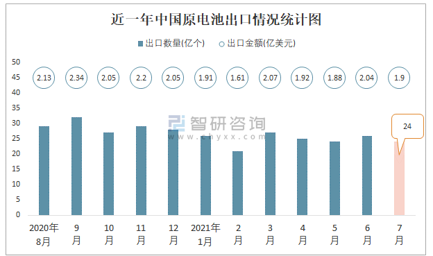 根據中國海關數據顯示:2021年7月中國原電池出口數量為24億個,同比下降20.1%,出口金額為1.9億美元,同比下降12.8%;2021年1-7月中國原電池,出口數量為174億個,出口金額為13.3億美元。