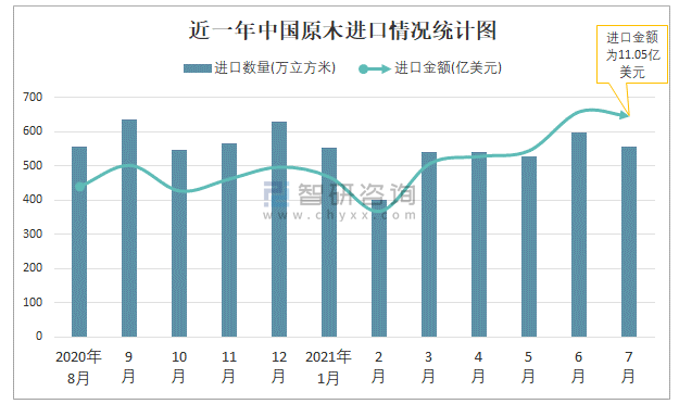 2021年7月中國(guó)原木進(jìn)口數(shù)量和進(jìn)口金額分別為555萬(wàn)立方米和11.05億美元