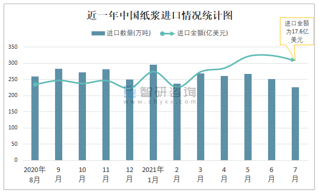 2021年7月中國紙漿進口數量和進口金額分別為225萬噸和17.6億美元