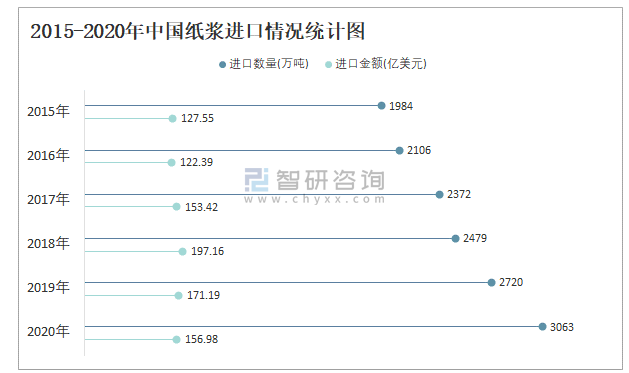 2015-2020年中國紙漿進口情況統計圖