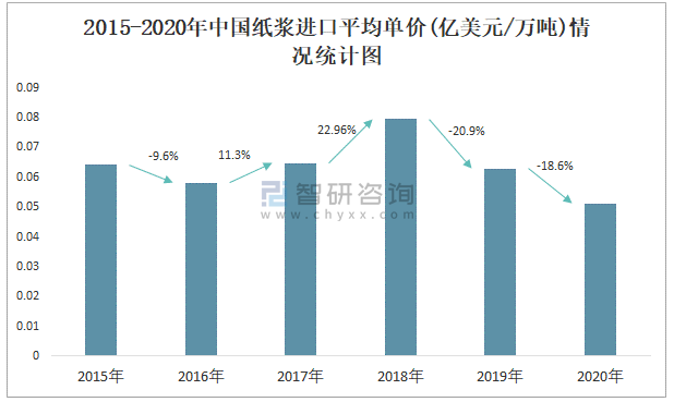 根據中國海關數據顯示:2015-2020年中國紙漿進口數量逐年遞增,進口金額2018年達到最高值,此后逐年遞減;2015-2020年中國紙漿進口平均單價2018年增長速度最快,并達到最大值,而2019年中國紙漿進口平均單價下降速度最快,下滑了20.9%。
