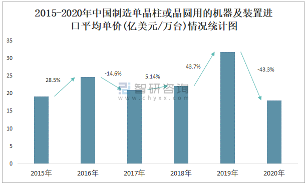 2015-2020年中國制造單晶柱或晶圓用的機器及裝置進口平均單價(億美元/萬臺)情況統計圖