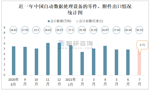 根據中國海關數據顯示:2021年7月中國自動數據處理設備的零件、附件進口數量為0.74萬噸,同比增長0.4%,進口金額為23.59億美元,同比增長32.9%,2021年7月中國自動數據處理設備的零件、附件出口數量為4.71萬噸,同比下降14.5%,出口金額為30.33億美元,同比增長7.6%;2021年1-7月中國自動數據處理設備的零件、附件進口數量為4.59萬噸,進口金額為131.11億美元,出口數量為35.1萬噸,出口金額為185.72億美元。