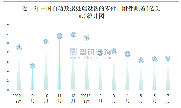 根據中國海關數據顯示:近一年中國自動數據處理設備的零件、附件進口金額總體小于出口金額,進出口貿易全部為順差,順差規模在7月有所擴大。