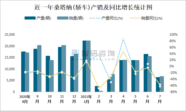 近一年桑塔納(轎車)產銷及同比增長統計圖