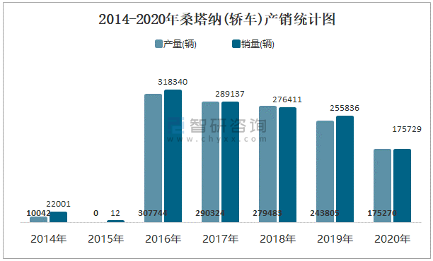 2014-2020年桑塔納(轎車)產銷統計圖