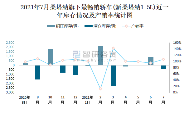 2021年7月桑塔納旗下最暢銷車(新桑塔納1.5L)近一年庫存情況及產銷率統計圖