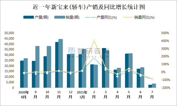 近一年新寶來(轎車)產銷及同比增長統計圖