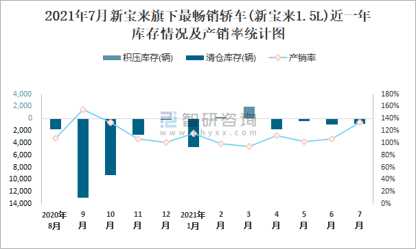 2021年7月新寶來旗下最暢銷車(新寶來1.5L)近一年庫存情況及產銷率統計圖