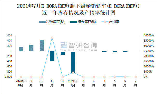 2021年7月E-BORA(BEV)旗下最暢銷車(E-BORA(BEV))近一年庫存情況及產銷率統計圖