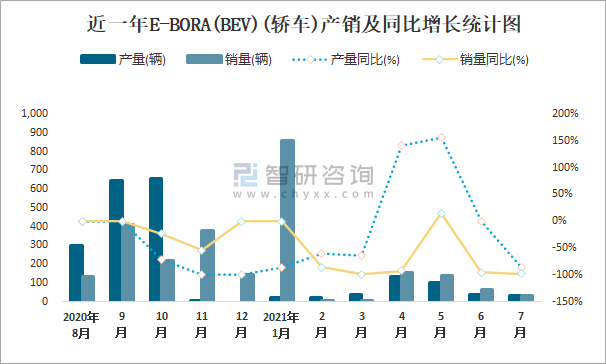 根據中國汽車工業協會數據可知:2021年7月E-BORA(BEV)(轎車)產量為33輛,同比下降86.9%,銷量為32輛,同比下降97.5%,當月產銷率為96.97%;2021年1-7月E-BORA(BEV)(轎車)累計產量為387輛,同比下降44.2%,累計銷量為1247輛,同比下降73.8%,累計產銷率為322.22%;2019-2020年E-BORA(BEV)(轎車)銷量有所增加,且近2年總產量大于總銷量,積壓了庫存845輛。