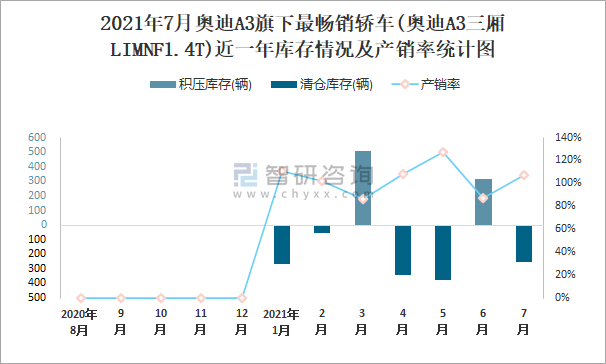 2021年7月奧迪A3旗下最暢銷車(奧迪A3三廂LIMNF1.4T)近一年庫存情況及產銷率統計圖