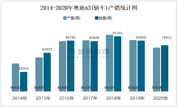 2014-2020年奧迪A3(轎車)產銷統計圖