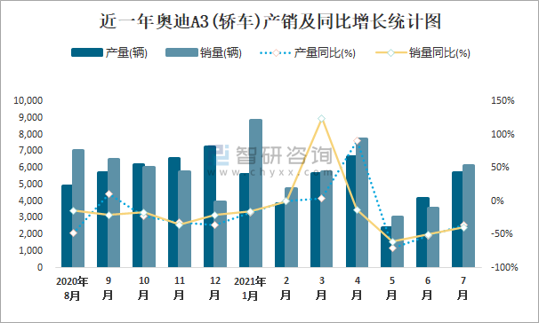 近一年奧迪A3(轎車)產銷及同比增長統計圖