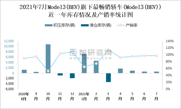 2021年7月MODEL3(BEV)旗下最暢銷車(Model3(BEV))近一年庫存情況及產銷率統計圖