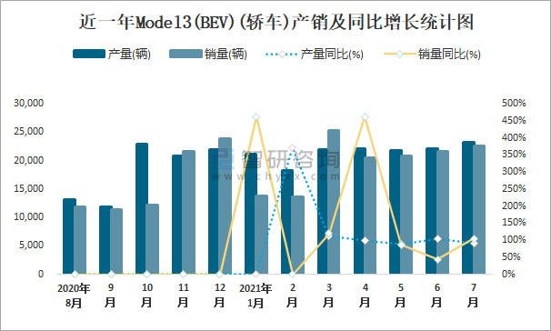 根據中國汽車工業協會數據可知:2021年7月Model3(BEV)(轎車)產量為23227輛,同比增長91.1%,銷量為22614輛,同比增長105.3%,當月產銷率為97.36%;2021年1-7月Model3(BEV)(轎車)累計產量為150581輛,同比增長141.5%,累計銷量為149229輛,同比增長162.9%,累計產銷率為99.1%;且2020年Model3(BEV)(轎車)總產量大于總銷量,積壓了庫存15498輛。