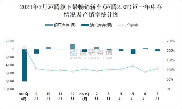 2021年7月邁騰旗下最暢銷車(邁騰2.0T)近一年庫存情況及產銷率統計圖