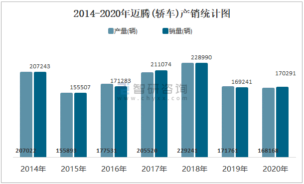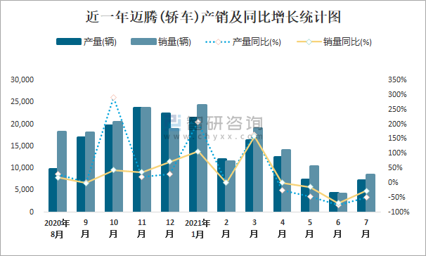 根據中國汽車工業協會數據可知:2021年7月邁騰(轎車)產量為7252輛,同比下降49.7%,銷量為8436輛,同比下降27.1%,當月產銷率為116.33%;2021年1-7月邁騰(轎車)累計產量為81453輛,同比增長7.2%,累計銷量為92214輛,同比增長30%,累計產銷率為113.21%;2014-2020年邁騰(轎車)產銷量均在2018年達到最高值,次年大幅度下滑,且近7年總產量大于總銷量,積壓了庫存1507輛。