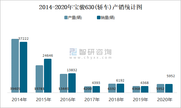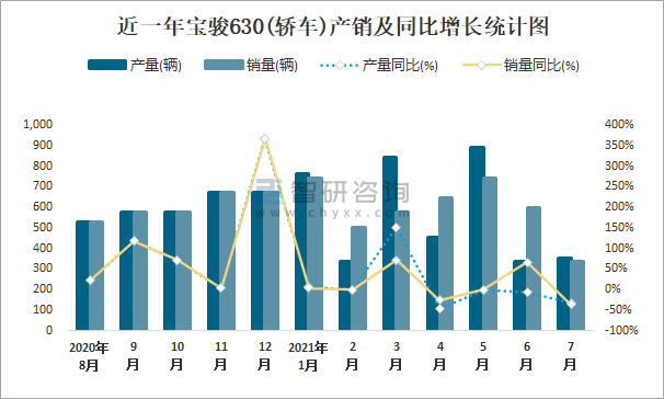 根據中國汽車工業協會數據可知:2021年7月寶駿630(轎車)產量為354輛,同比下降33%,銷量為336輛,同比下降36.4%,當月產銷率為94.92%;2021年1-7月寶駿630(轎車)累計產量為3972輛,同比增長35.7%,累計銷量為4152輛,同比增長41.8%,累計產銷率為104.53%;2014-2020年寶駿630(轎車)產銷量均在2014年達到最高值,此后總體呈現下降趨勢,且近7年總銷量大于總產量,清倉庫存3258輛。