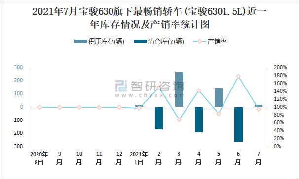 根據中國汽車工業協會數據統計可知:2021年7月寶駿630(轎車)旗下只有1款寶駿6301.5L轎車在銷售;近一年寶駿6301.5L共清倉庫存180輛,其產銷率存在一定幅度波動,2021年6月產銷率最高(178.57%),清倉庫存264輛,2021年3月產銷率偏低(68.57%),積壓庫存264輛。