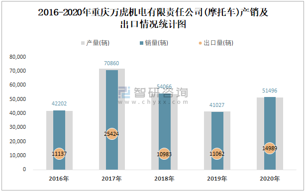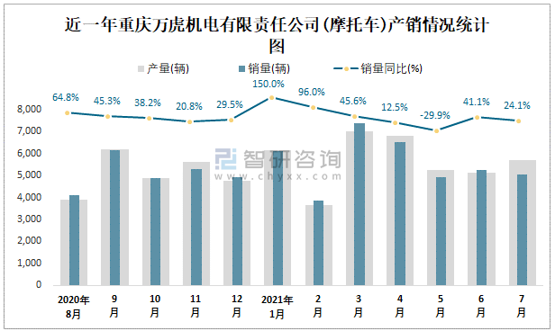 根據中國汽車工業(摩托車)產銷快訊數據顯示:2021年7月重慶萬虎機電有限責任公司(摩托車)產量為5719輛,同比增長27.74%,銷量為5041輛,同比增長24.13%;2021年1-7月重慶萬虎機電有限責任公司(摩托車)累計產量為39724輛,同比增長53.5%,累計銷量為39122輛,同比增長49.78%;2016-2020年重慶萬虎機電有限責任公司(摩托車)產銷量2019年跌至最低值,此后有所回升,且近5年總銷量大于總產量,清倉庫存52輛,出口量偏少,銷量以內銷為主。